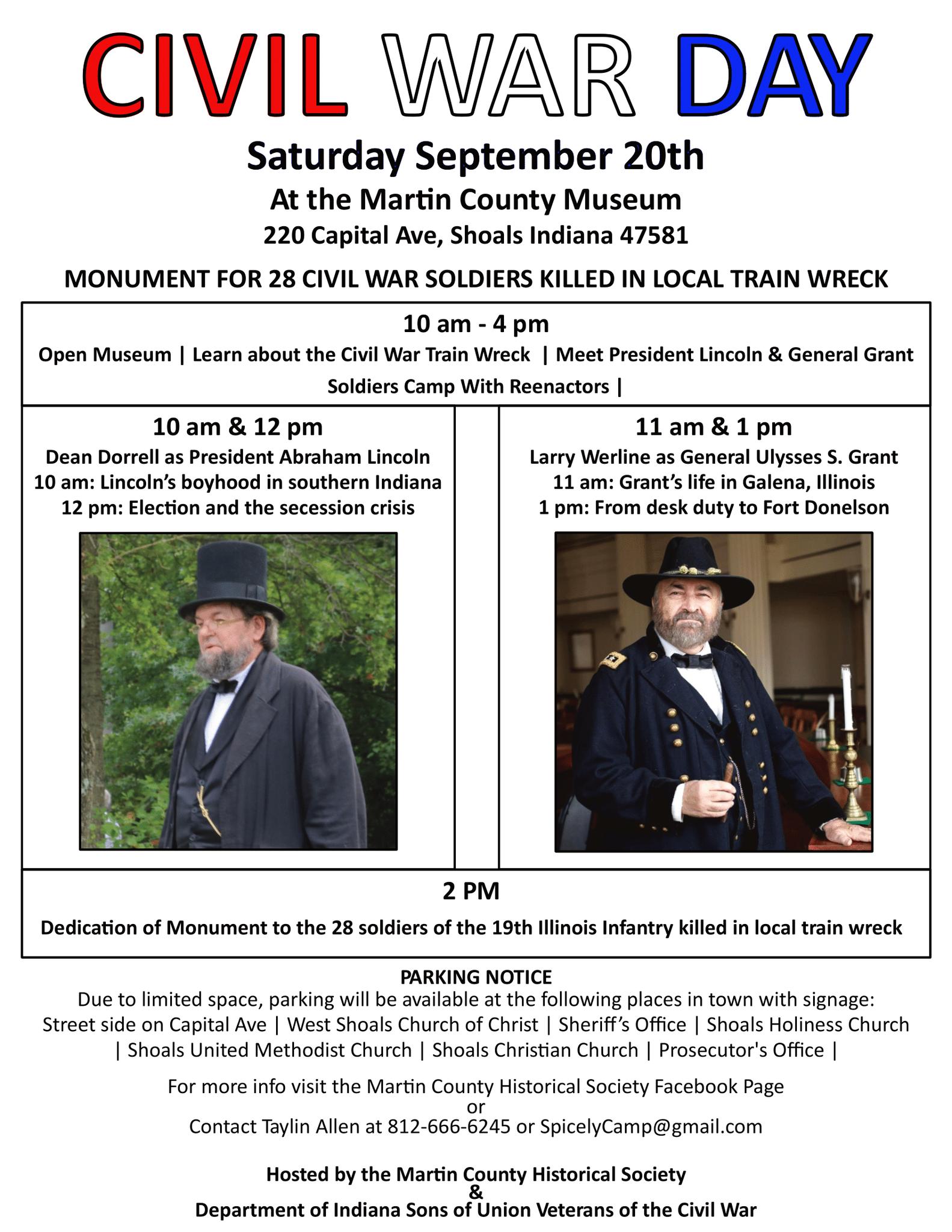 19th Illinois Train Wreck Monument Dedication (Address: 220 Capital Ave, Shoals Indiana 47581) on the grounds of the Martin County Museum, 2:00 PM EDT. Contact is Captain Mike Beck.