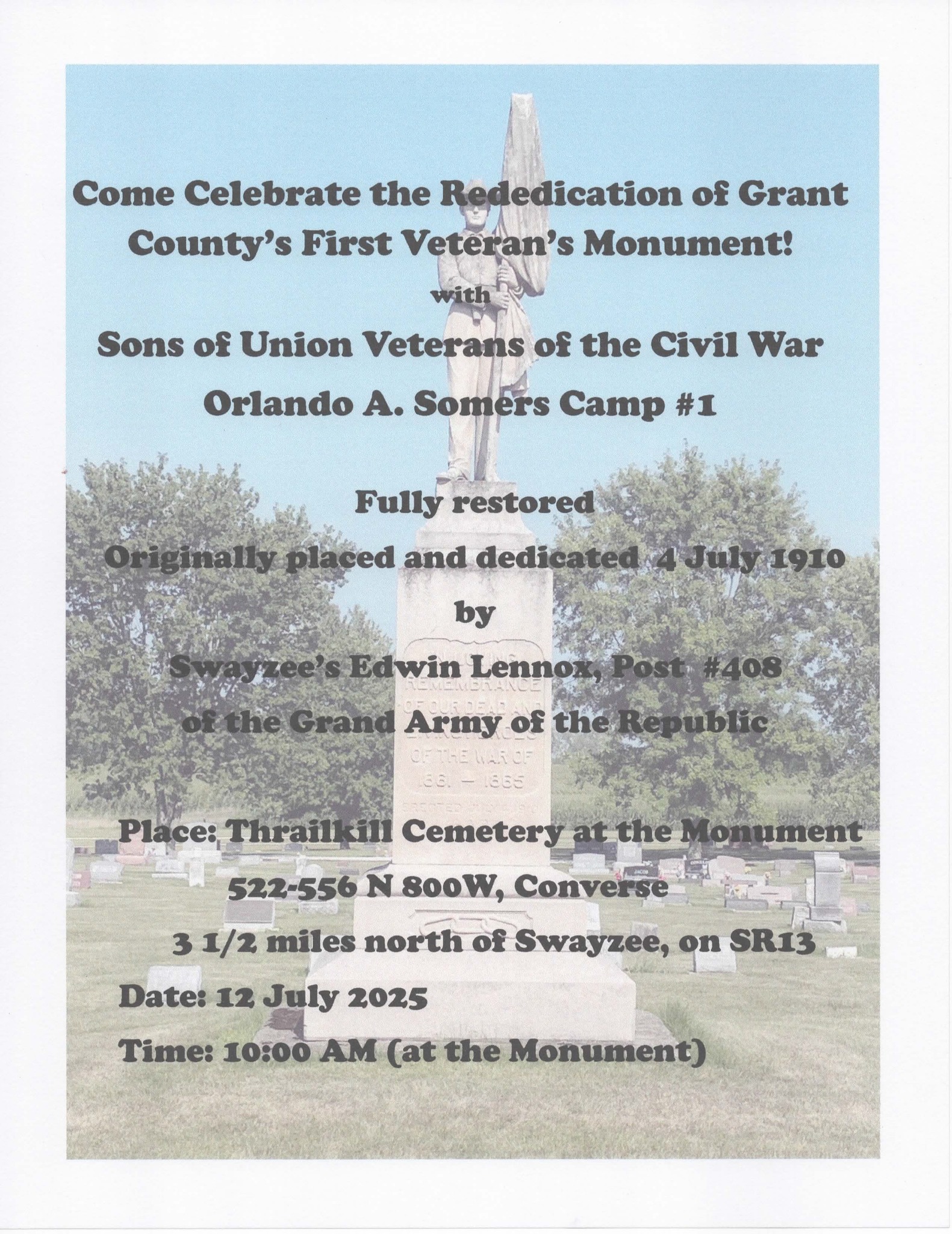 Thrailkill Cemetery Monument Rededication on July 12th at 10:00 AM EDT. The cemetery is located 3-4 miles north of Swayzee on State Road IN 13 (Address: 441 N 800 W 27, Converse, Indiana). Contacts are Cpl. Randy McNally or Lt. Bill Adams.